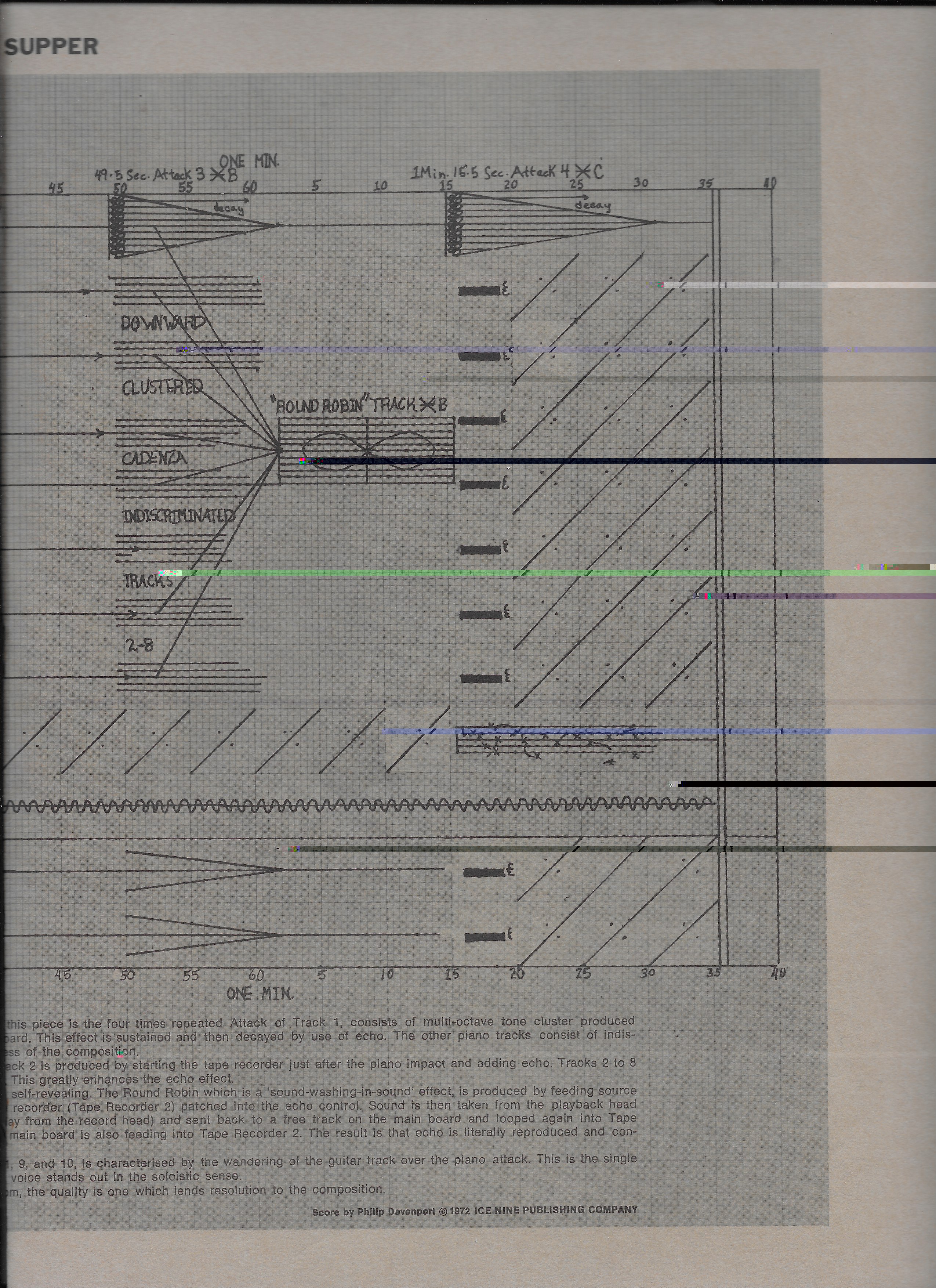 - The bent-note glisando effect at Attack 2 is produced by starting the tape recorder just after the piano impact and adding echo. Tracks 2 to 8 begin at half-scond intervals at sec. 25. This greatly enhances the echo effect.